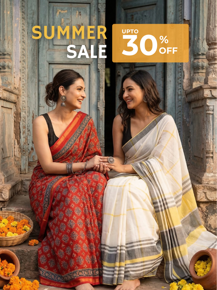 Mulmul cotton sarees are the best choice for summer — the ultra-fine weave is highly breathable and keeps you cool even in humid weather. Our tissue pure cotton sarees are also a great summer option for those who want a slightly more structured drape.