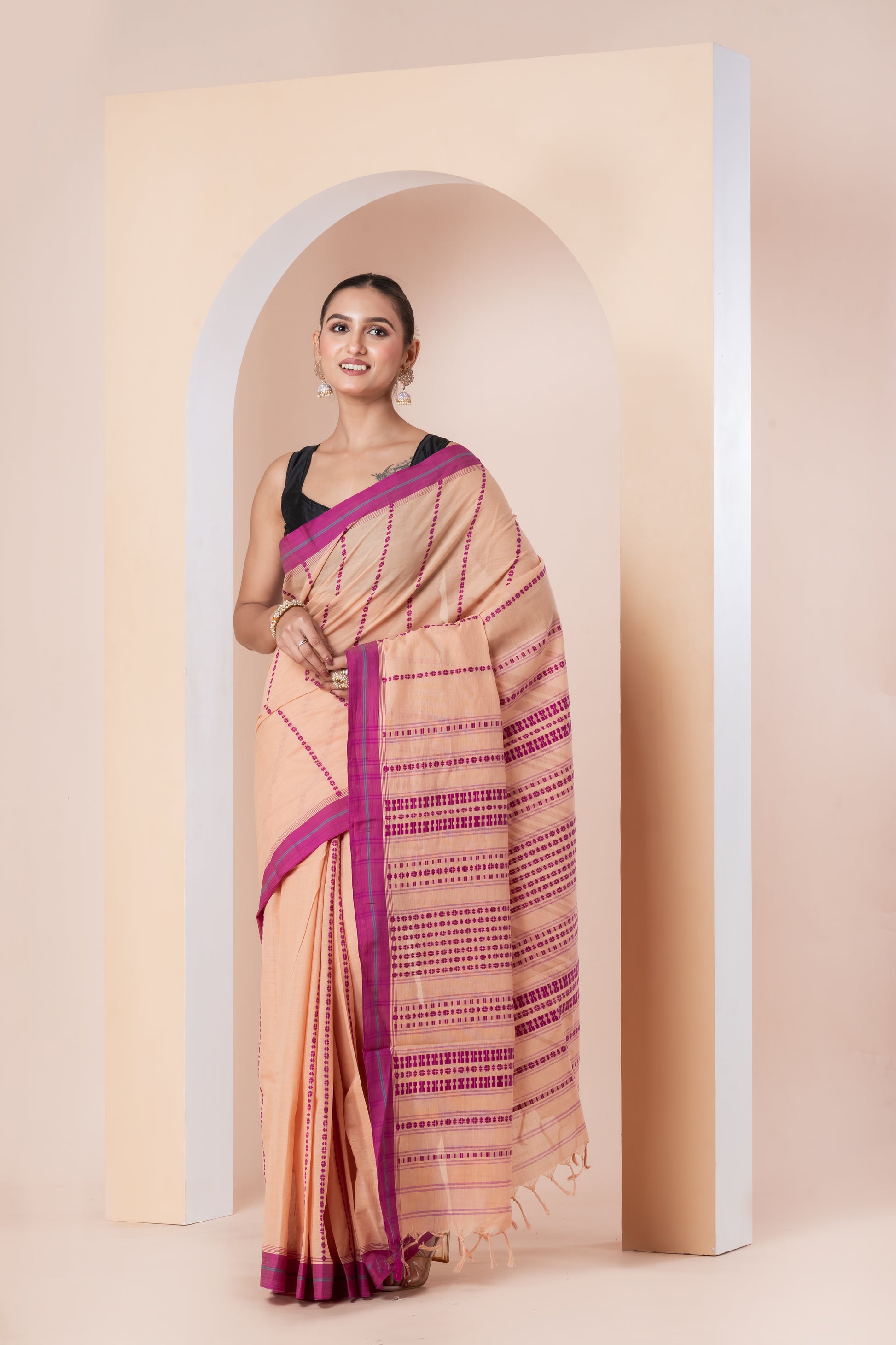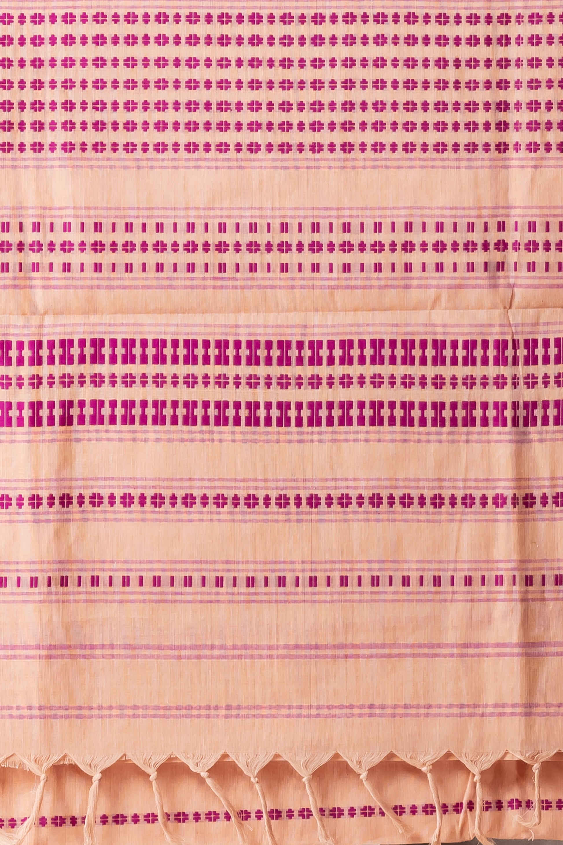 The Pakhna Begumpuri Saree is a traditional handloom saree with a warm peach base and vibrant magenta borders, showcasing the classic Begumpuri weaving style. Its intricate geometric patterns and striped pallu add a touch of elegance. Lightweight and breathable, it’s perfect for office wear, cultural events, or professional gatherings.