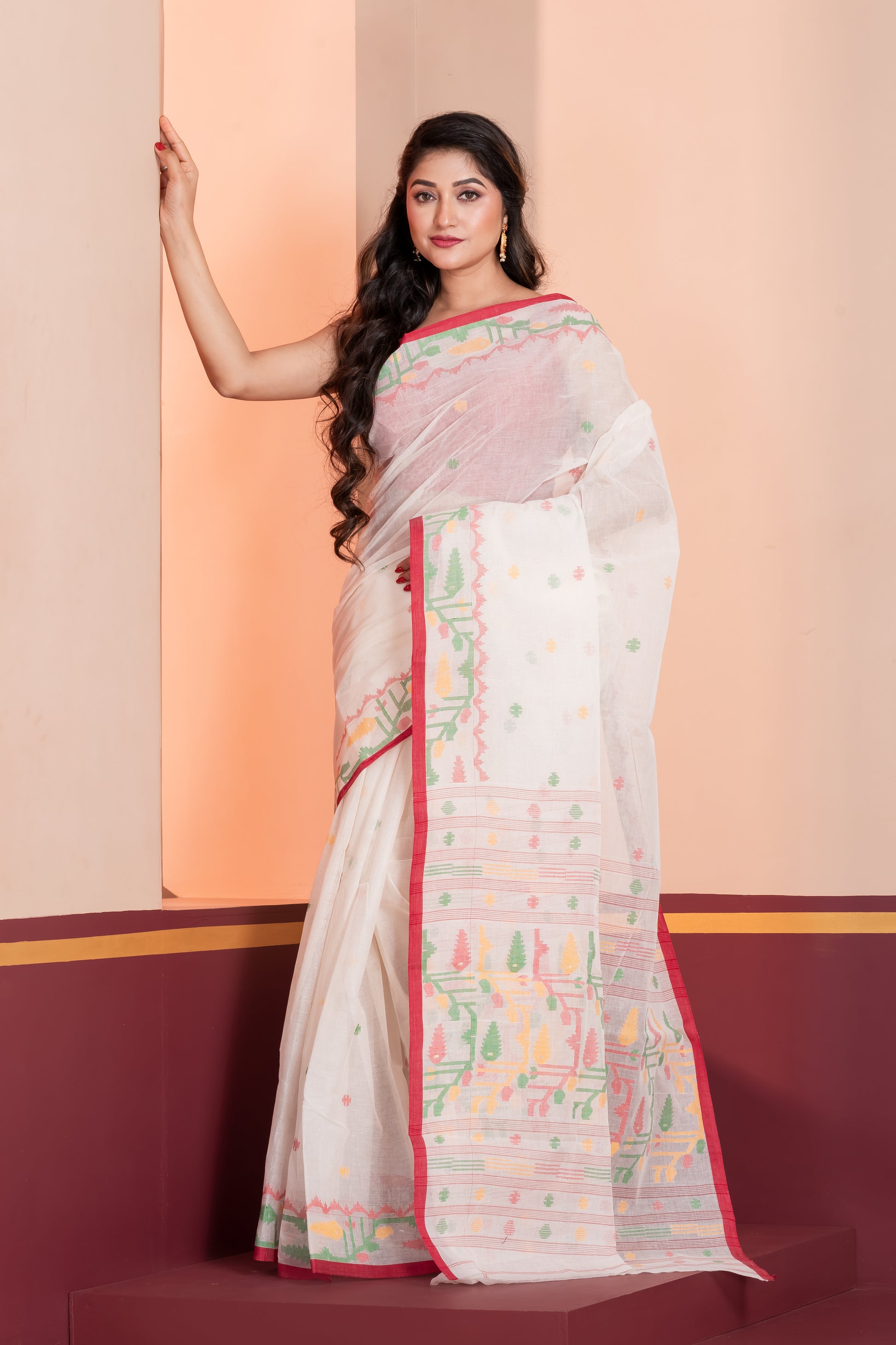 Pakhna White & Red Pure Cotton Handwoven Bengal Jamdani Saree
